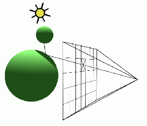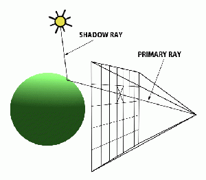 An alternative to forward ray tracing is backward tracing. In this case, instead of tracing rays from the light source to the receptor, the rays are traced backwards from the receptor to the objects. This is a convenient solution to the problem presented by the forward ray tracing technique. Since simulations cannot be as fast and perfect as nature, a compromise is made and a ray is traced from the receptor into the scene (called primary ray, visibility ray, or camera ray). If this ray hits an object, another ray can the sent from the hit point to the light source in order to find out how much light it receives. This second ray is called a light or shadow ray. When this ray is obstructed by another object, it means that the original hit point is in a shadow. [4]