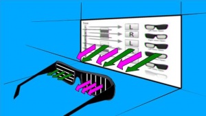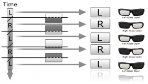Active shutter has been the primary technology used in home entertainment systems. The mechanism takes advantage of the high frame rates that are available in LED and plasma TVs (120 Hz and above). The TV displays two high definition pictures at a high refreshment frequency (>60 Hz) to achieve temporal multiplexing. The shutter glasses sync with the TV to actively filter the corresponding frames so that each eye only receives the intended image.[9]